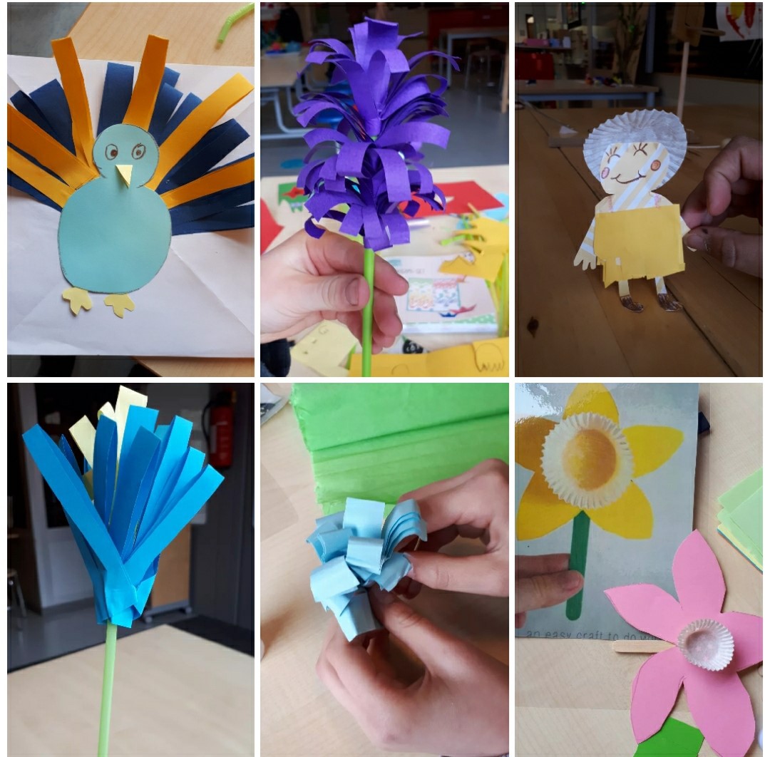 Es wurden schöne Sträuße im Hort gebastelt um den Frühling ins Haus zu holen. Dazu haben wir aus Krepppapier Blumen hergestellt, Äste gesammelt und diese Bunt angemalt, Pfeifenreiniger benutzt als Blumen Halterungen und aus Buntem Papier…