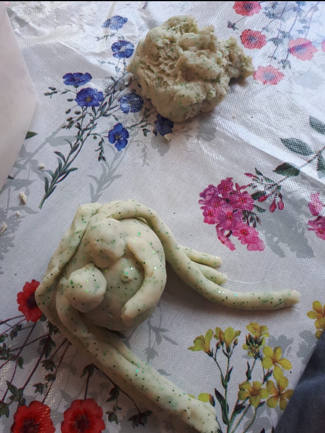Selbstgemachte Knete ist immer ein beliebtes Angebot bei den Kindern. Mit Mehl, Zitronensaft, heißem Wasser und Öl, in diesem Fall auch mit Glitzer, ist sie sehr leicht gemacht.