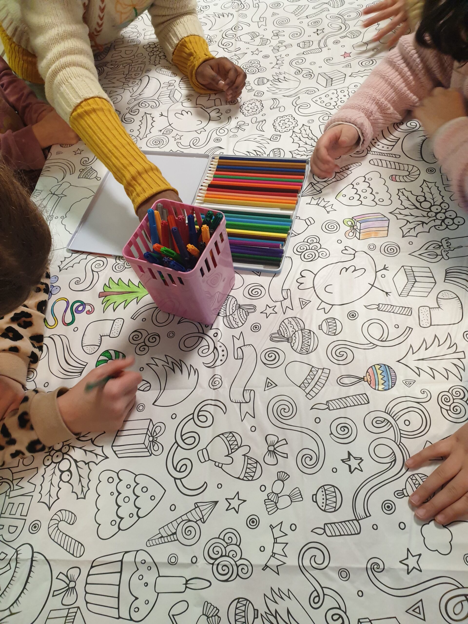 Wir machen viele verschiedene bunte Kreativangebote am Hort Müssenredder. Im Mädchenclub wurden z.B. kleine, weihnachtliche Magnetfiguren gebaut. Die Magnete haben wir hinten in die Figuren eingearbeitet. Für die Weihnachtsstimmung machen wir auch eine Tischdecke ganz bunt!